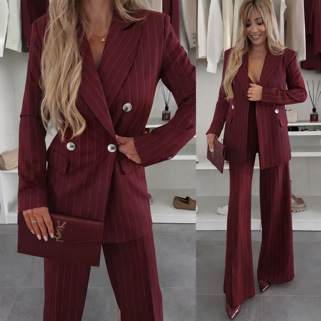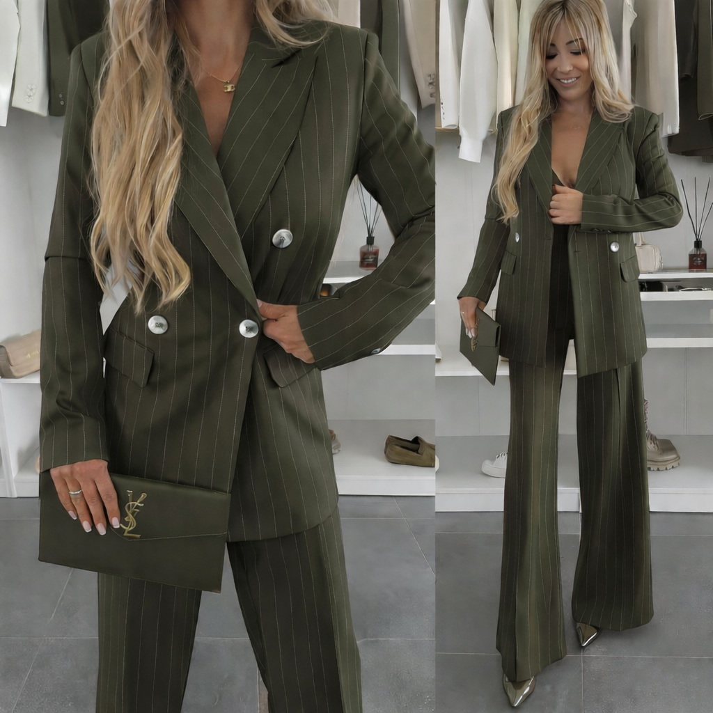 Questo completo gessato è l’equilibrio perfetto tra carattere e raffinatezza. La giacca doppiopetto, dalla linea strutturata ma femminile, valorizza la silhouette grazie al taglio sartoriale e ai dettagli curati, come i bottoni a contrasto e il rever deciso.