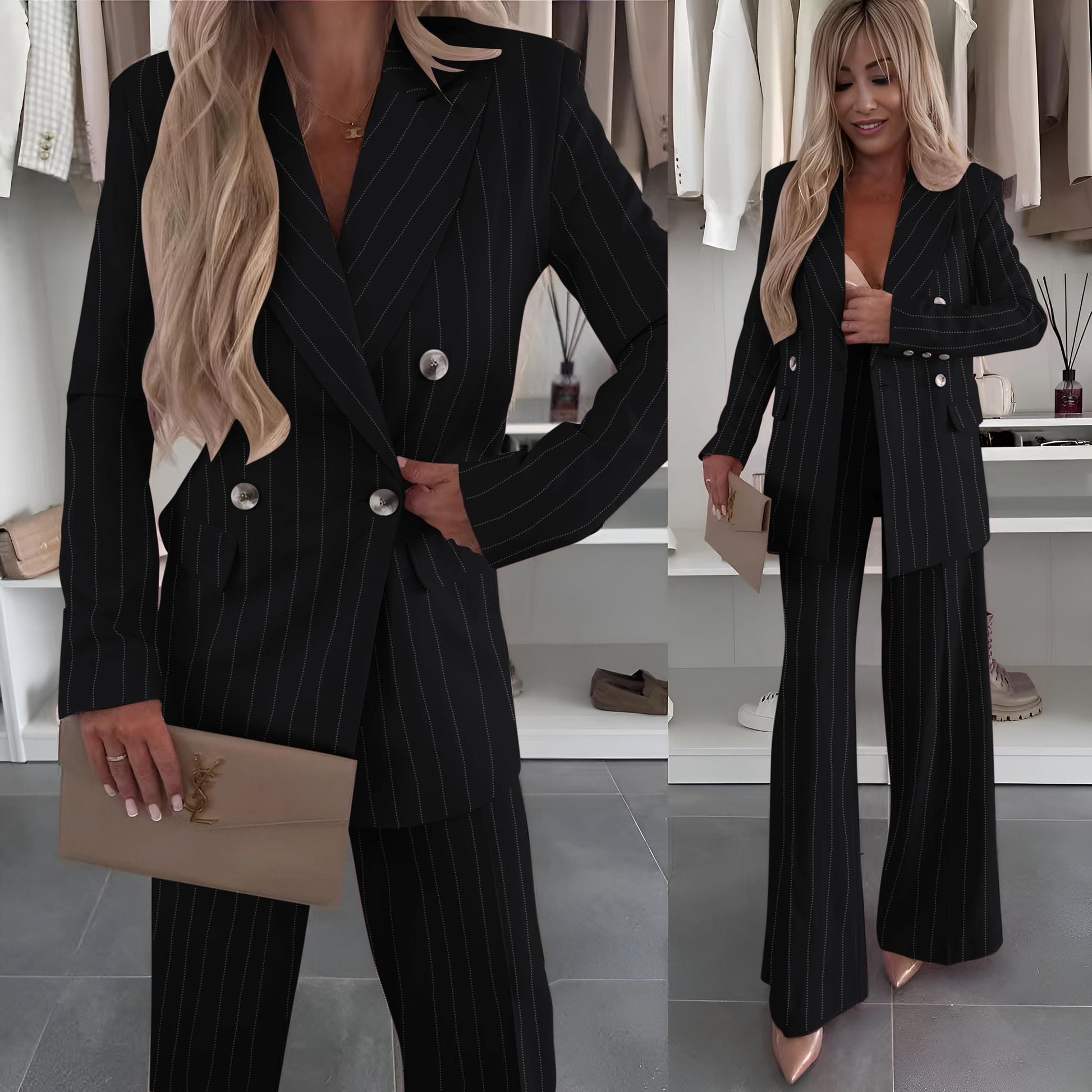 Il tessuto gessato aggiunge un tocco di classe senza tempo, rendendo questo look ideale sia per occasioni formali che per outfit più fashion e ricercati.